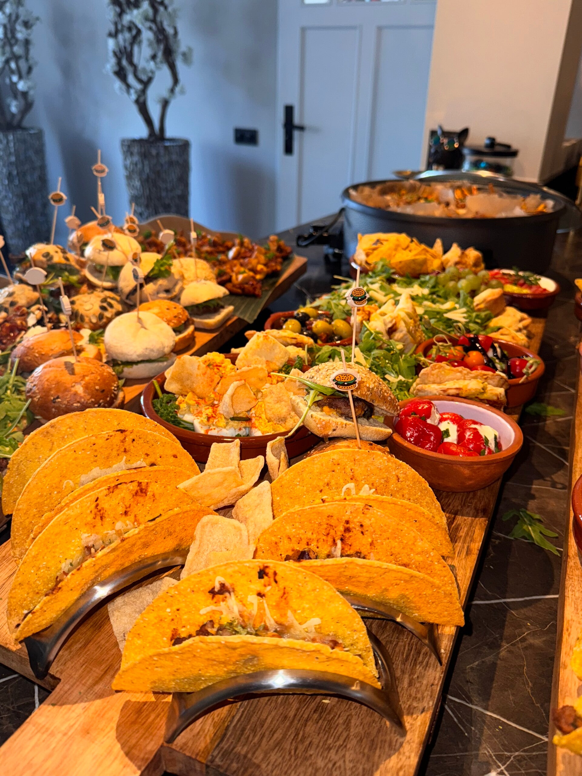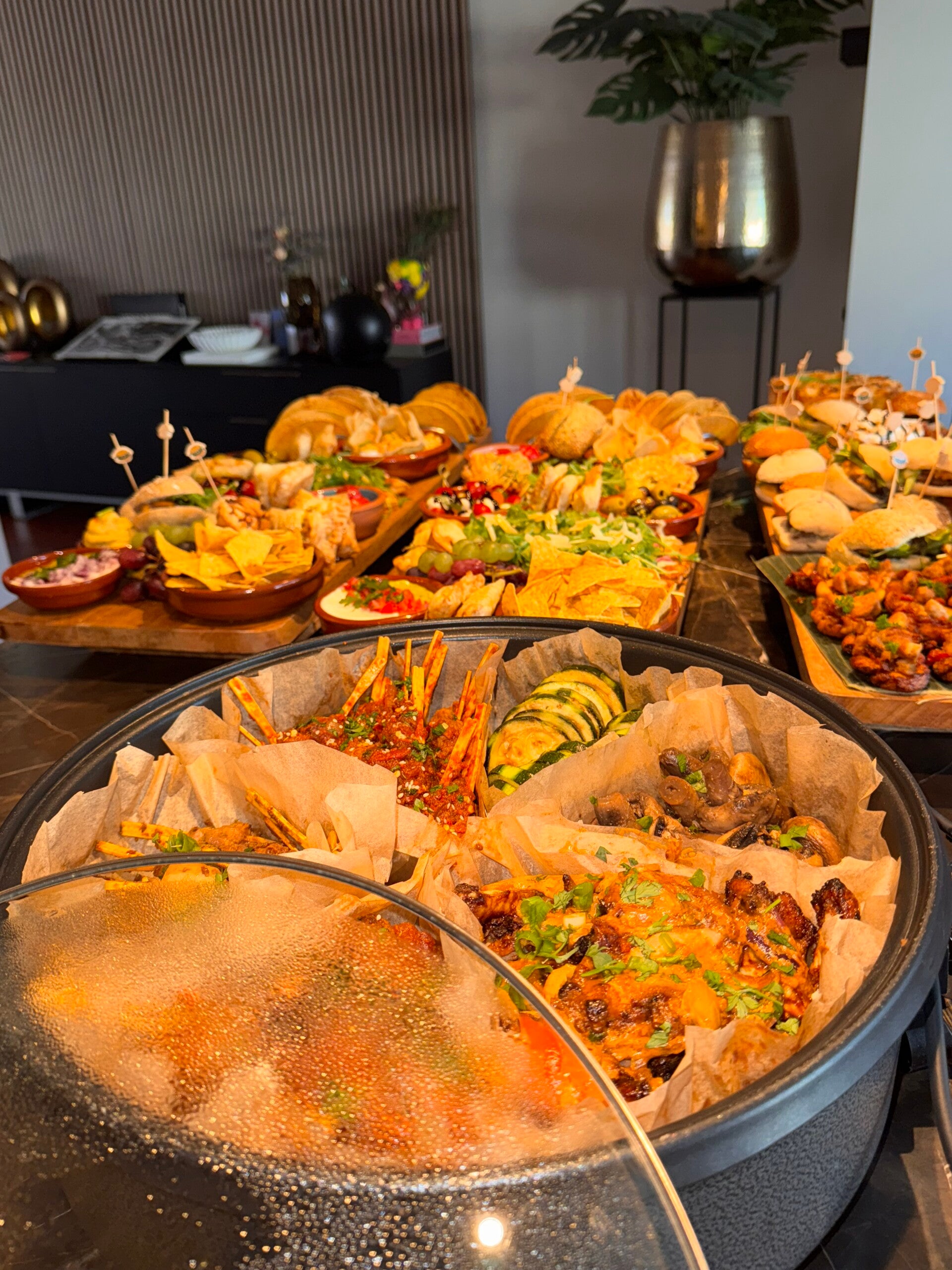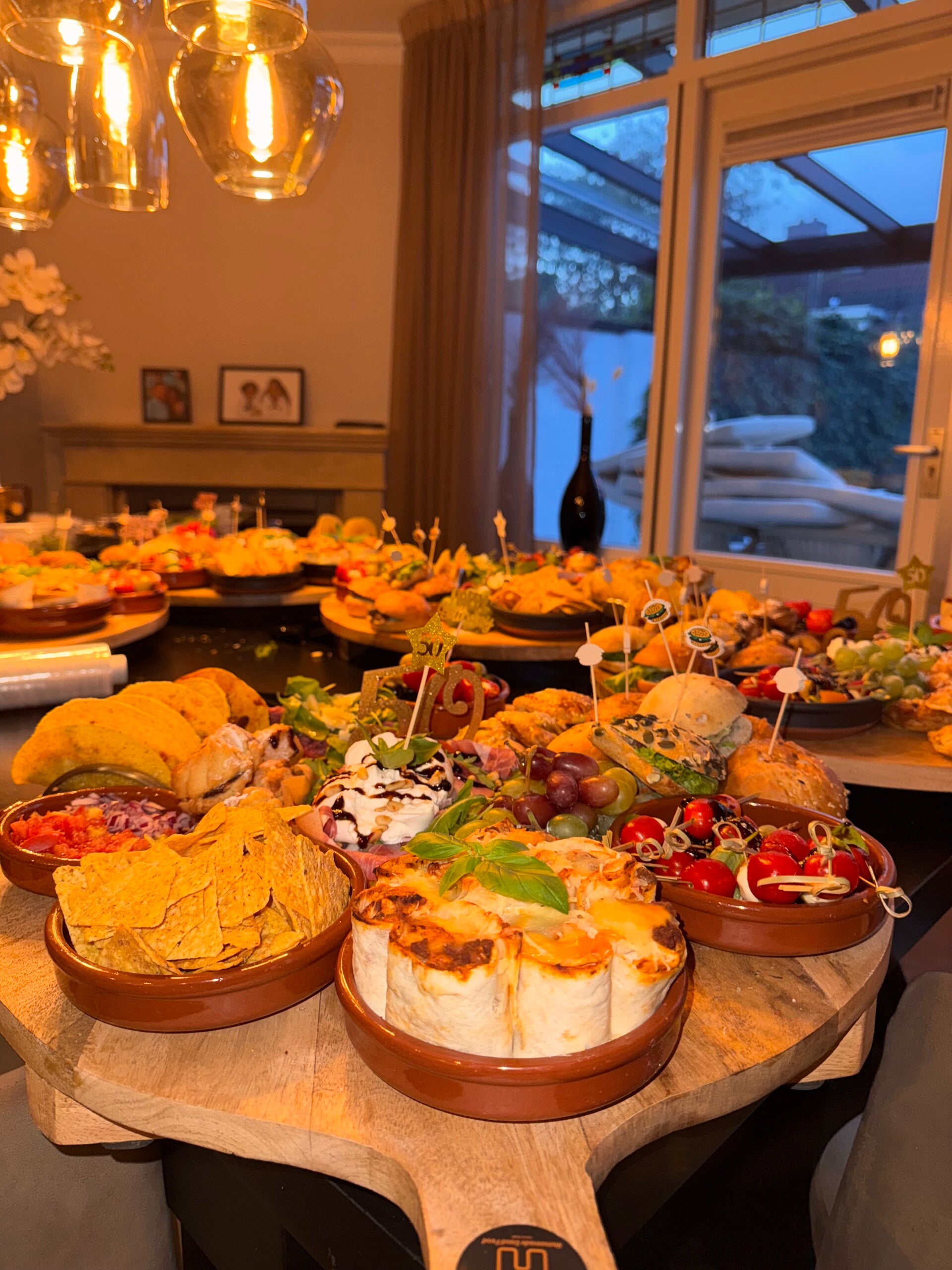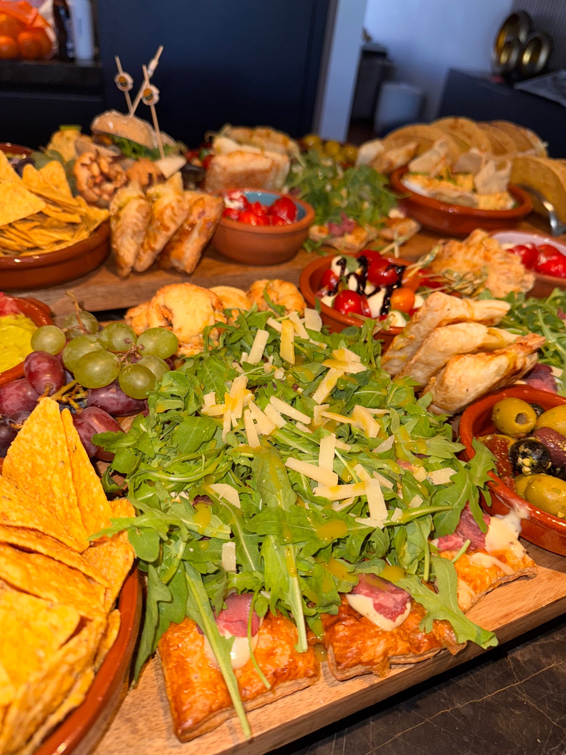 Snackpan van kipkluifjes gemarineerd in knoflook en ketjapmarinade, gehaktballetjes in tomatensaus, kipsatéstokjes in pindasaus en garnalen gemarineerd in chili/knoflook saus. Gevulde wraps met kipfilet en gehakt. Tortilla's chips en guacamole. Mini hamburgers, broodjes met kipkerrie en zure komkommer. Bladerdeeg met kipkerrie. Mini taco's. Gevulde eieren met knoflook kroepoek. Flammkuchen met spek en prei / naanbrood met pesto, ham en burrata. Bakbanaan met kip en tomatensausje. Bruschetta's met carpaccio. Zoete pepers gevuld met roomkaas. Champignons in ketjapsaus. Courgette in ketjap / gebakken aubergine. Spiesjes met tomaat en mozzarella. Druiven & Mini cakes en appeltaartjes.
