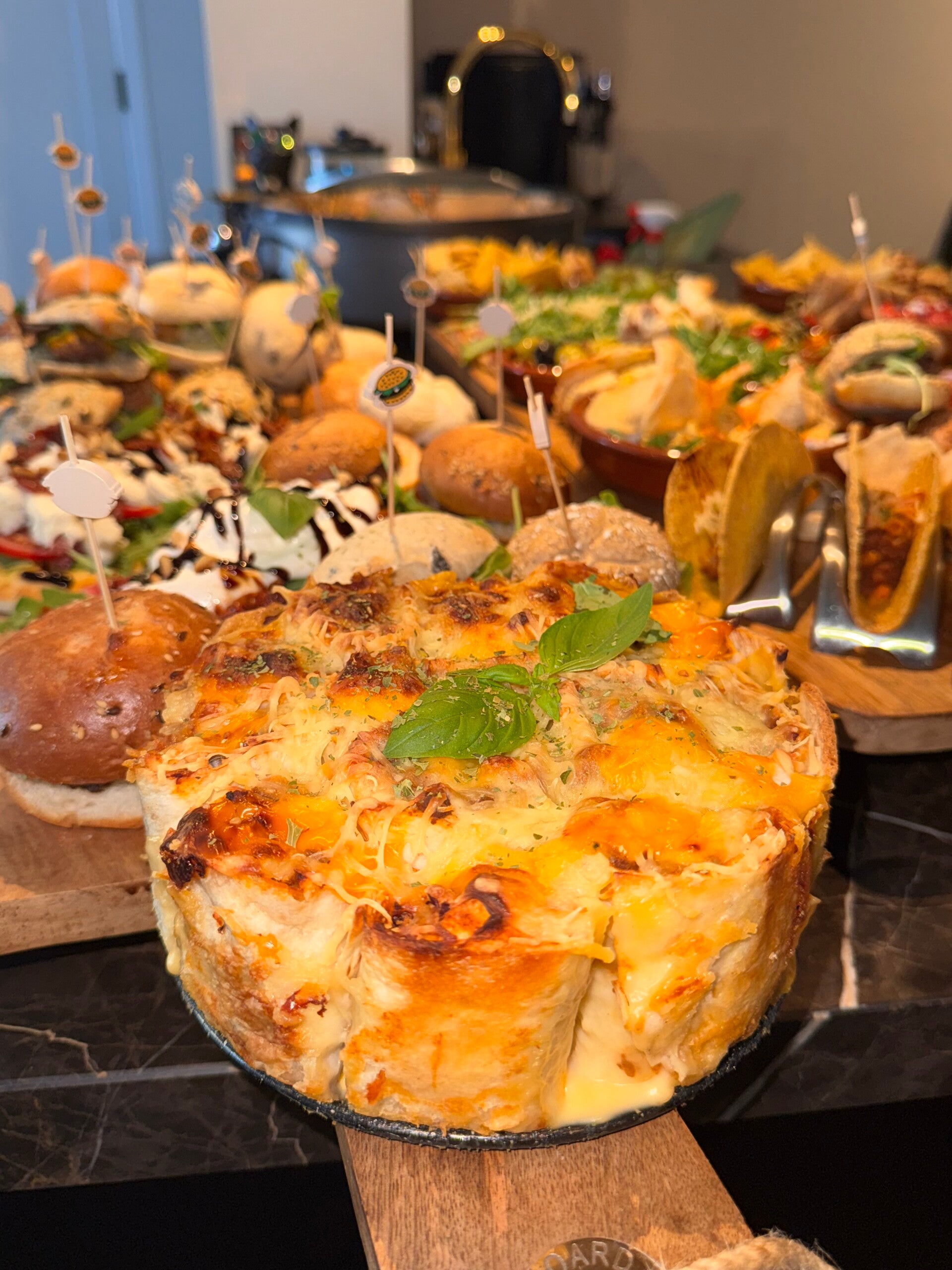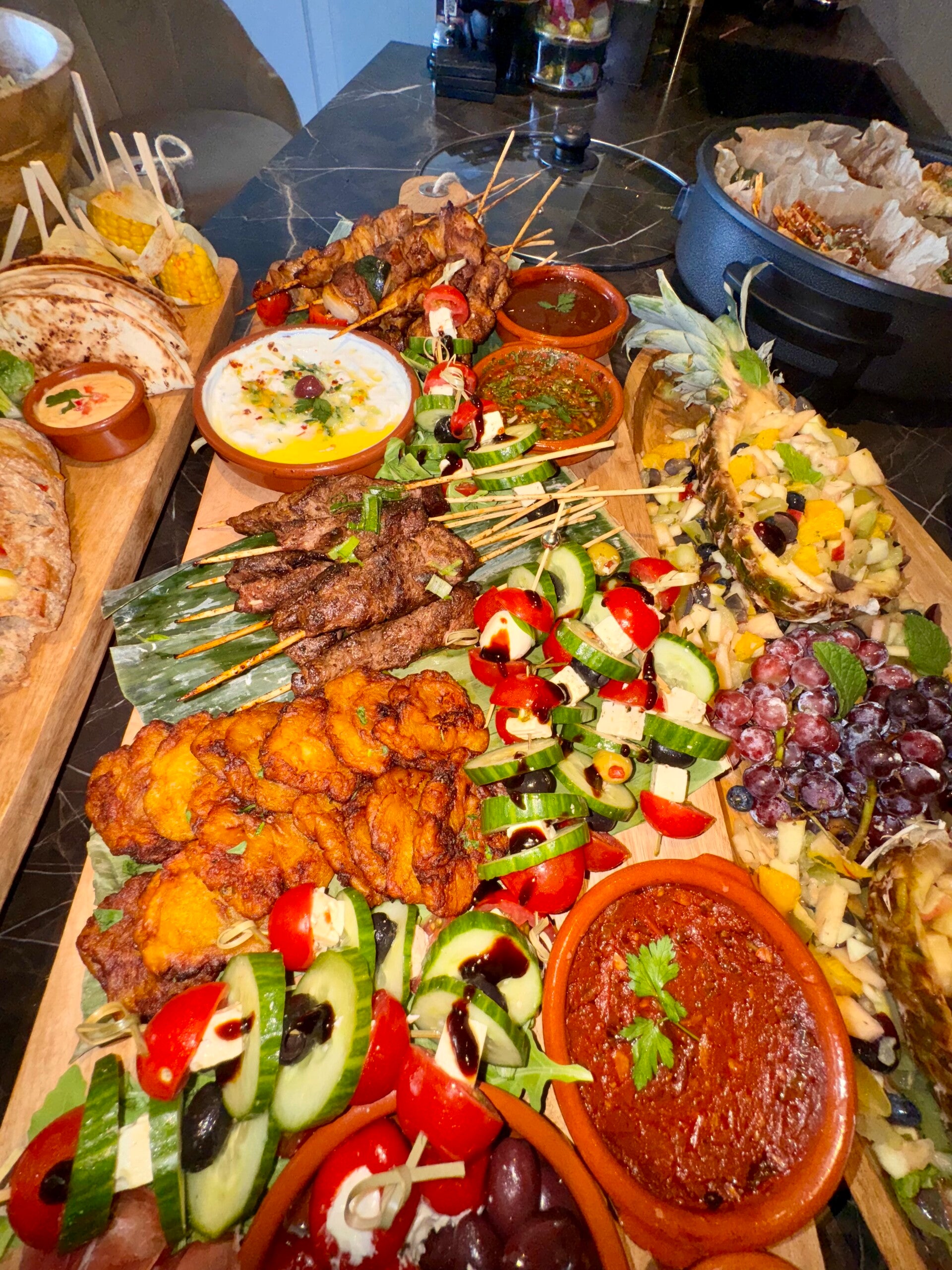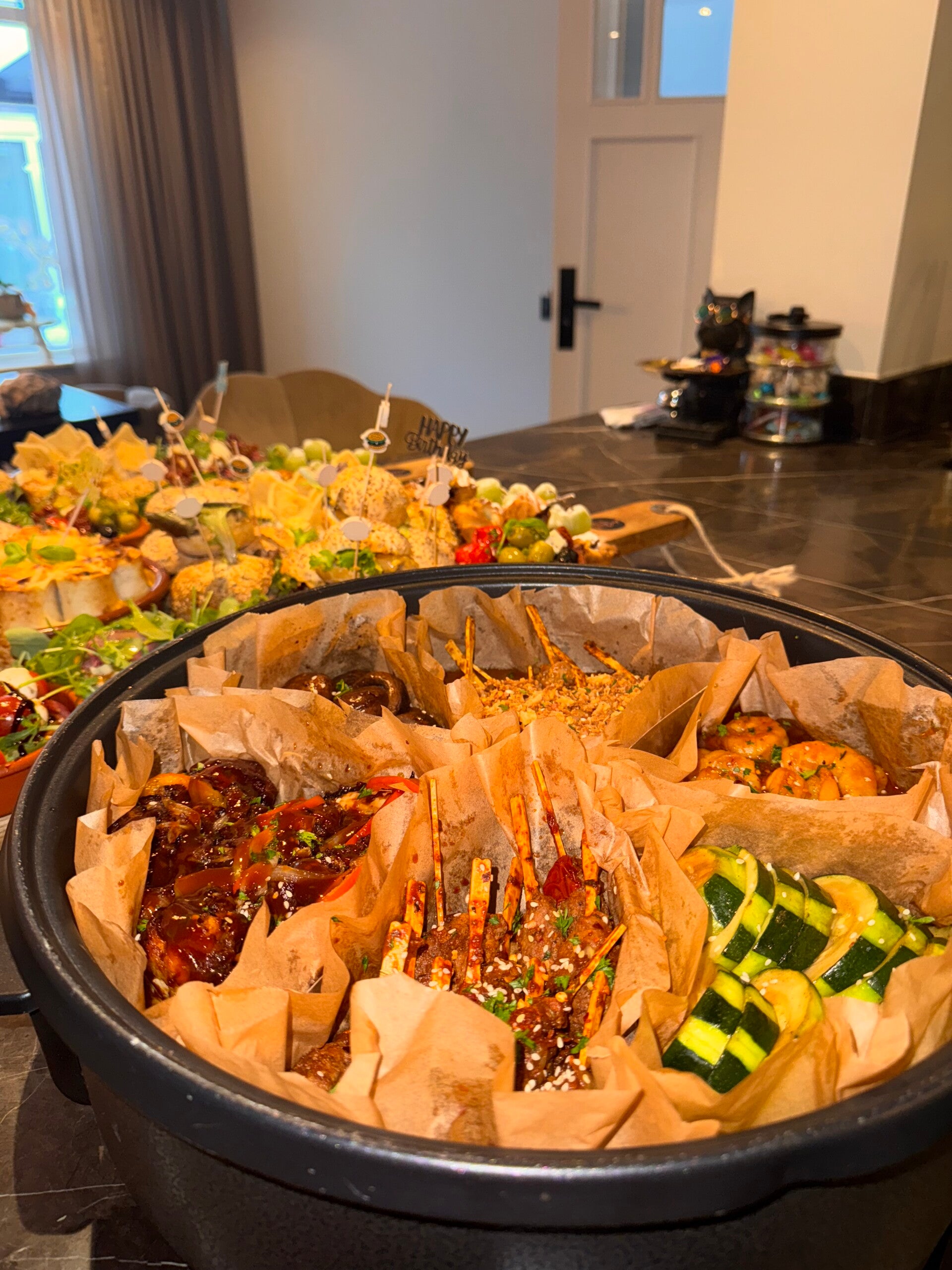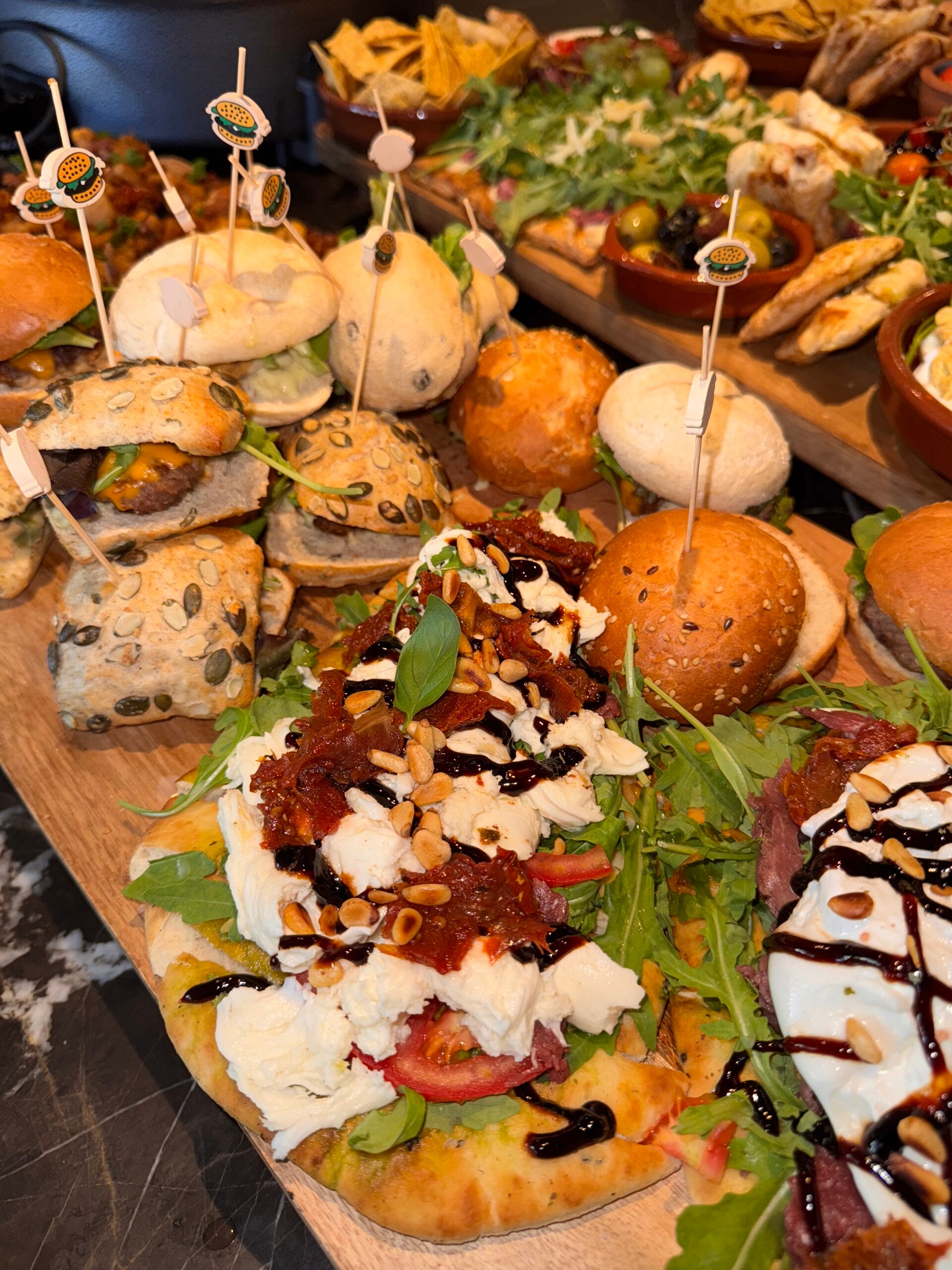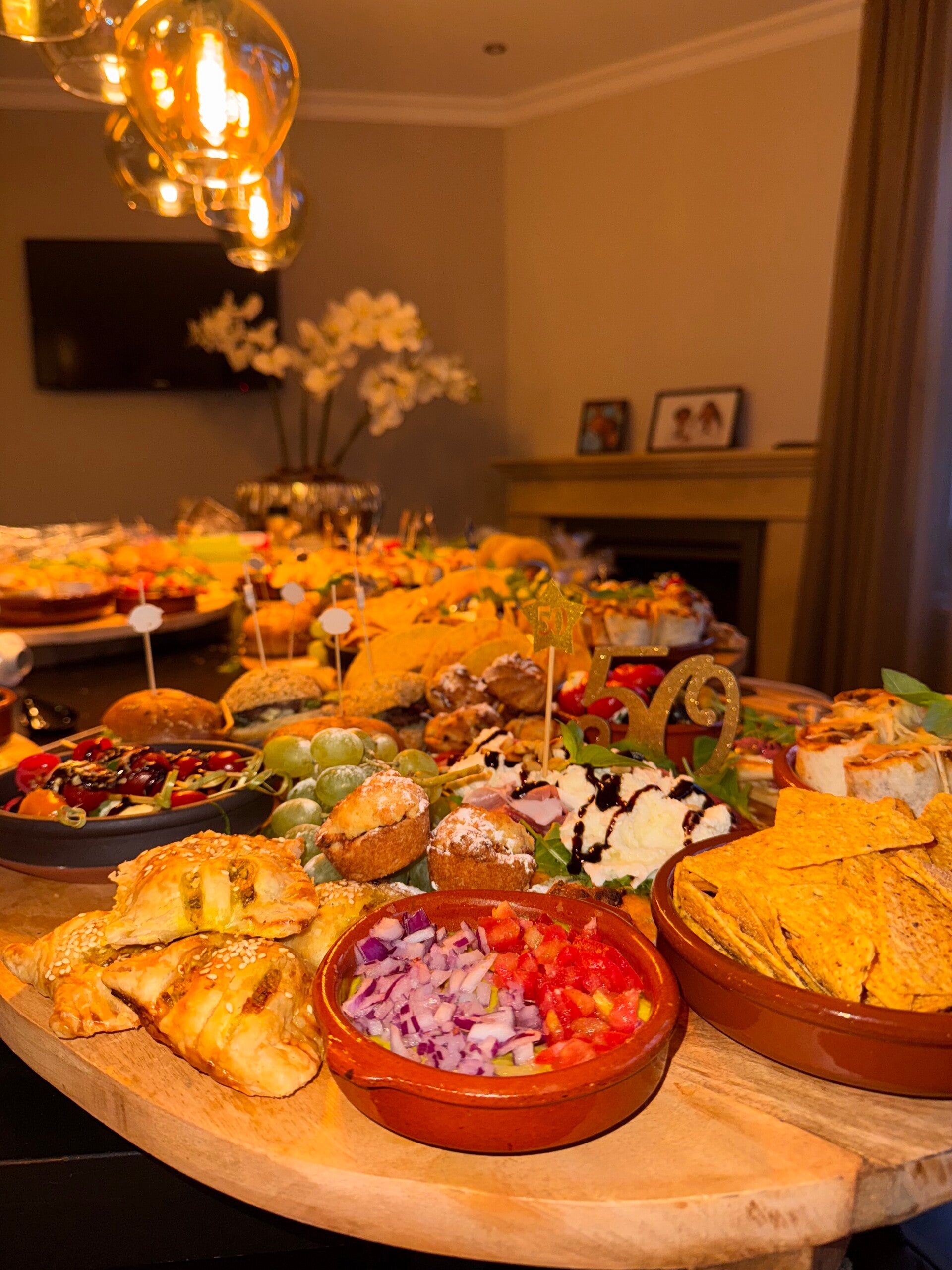 Snackpan van kipkluifjes gemarineerd in knoflook en ketjapmarinade, gehaktballetjes in tomatensaus, kipsatéstokjes in pindasaus en garnalen gemarineerd in chili/knoflook saus. Gevulde wraps met kipfilet en gehakt. Tortilla's chips en guacamole. Mini hamburgers, broodjes met kipkerrie en zure komkommer. Bladerdeeg met kipkerrie. Mini taco's. Gevulde eieren met knoflook kroepoek. Flammkuchen met spek en prei / naanbrood met pesto, ham en burrata. Bakbanaan met kip en tomatensausje. Bruschetta's met carpaccio. Zoete pepers gevuld met roomkaas. Champignons in ketjapsaus. Courgette in ketjap / gebakken aubergine. Spiesjes met tomaat en mozzarella. Druiven & Mini cakes en appeltaartjes.
