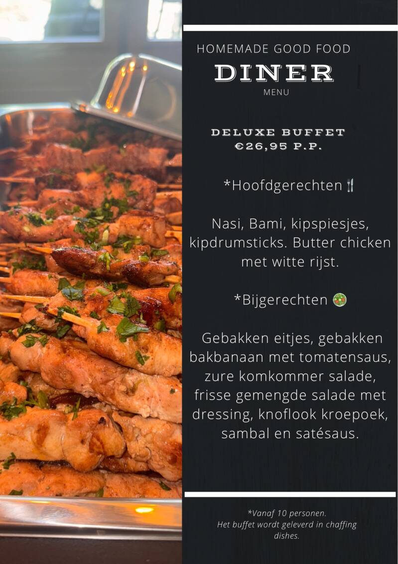 Het buffet bestaat uit: nasi, bami, butter chicken met witte rijst, kipspies of met kip drumsticks. Bakbanaan met tomatensaus, gebakken ei, zure komkommersalade, knoflook kroepoek, satésaus en sambal.