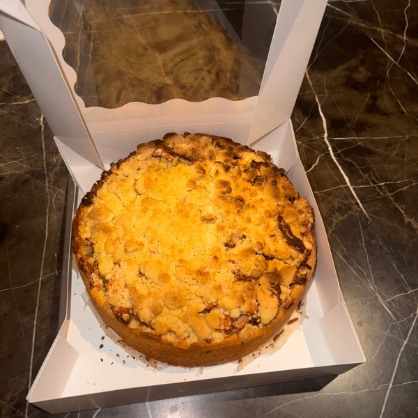 Knapperige kruimellaag met verse appelvulling, kaneel en roomboterbodem.